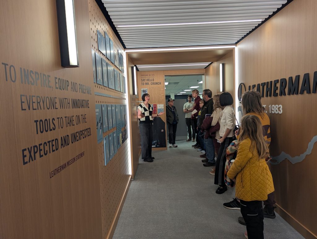 We kicked off our tour in the hallway of history. We heard the story of Tim Leatherman, who was inspired to create his tool while traveling Europe in a cranky Fiat. He needed something more than a scout knife; he needed pliers and a toolkit that fit in his pocket. It was the perfect lesson for our students: STEAM starts with solving a problem.