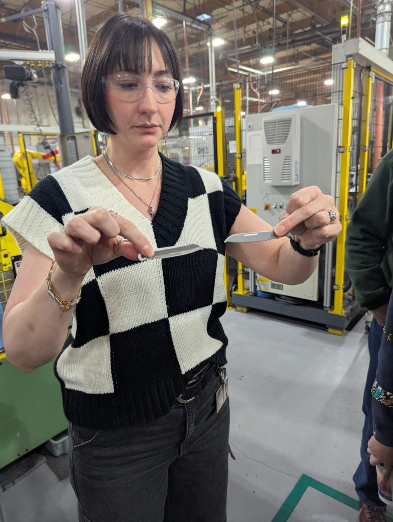 A highlight for many was the testing lab. We saw machines designed to whack, bend, and stress-test tools 10,000+ times to ensure they exceed their specifications. We also visited the Design Hub, where 3D printers allow engineers to hold a “prototype” of a new knife or tool within hours to test how it feels in the hand.